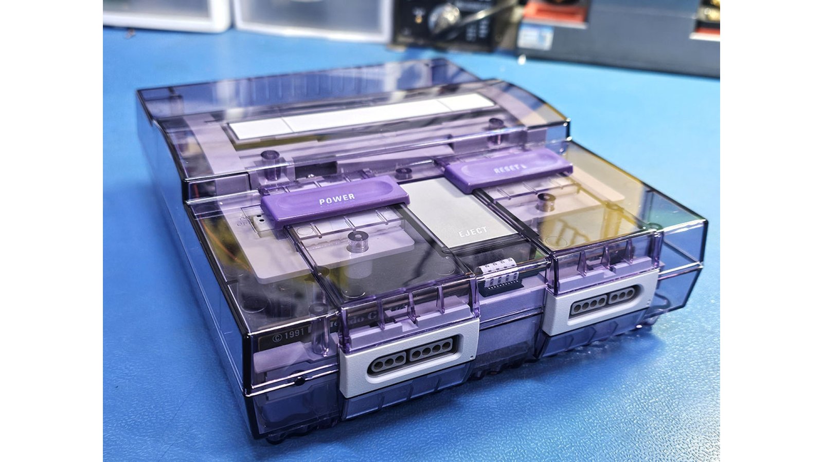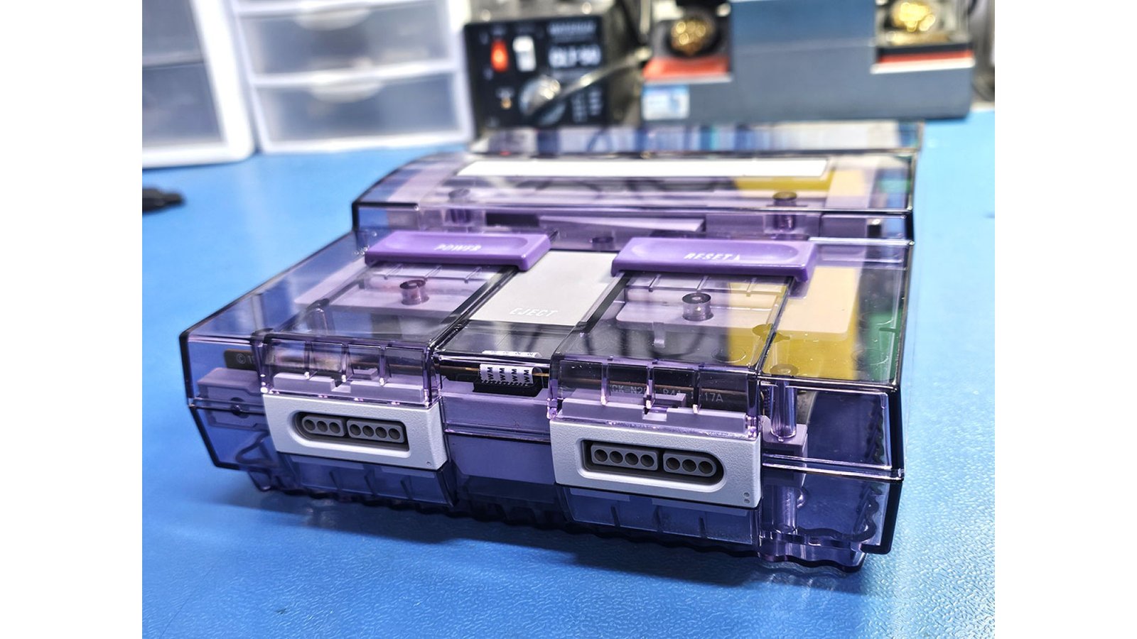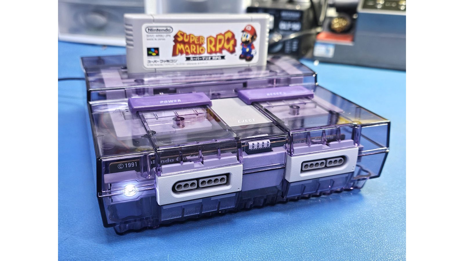 Available for purchase is a refurbished SNES. This specific system has been thoroughly cleaned and reconditioned with every capacitor replaced. This unit has been fitted with the SNES Edge-Enhancer, giving 1CHIP-like video output with stunning visual clarity for ALL video outputs. Composite Video and S-Video are fully functional and also benefit greatly from the Edge-Enhancer. This console is in excellent condition with only minor scuffs due to age and has been fitted with an Atomic Purple shell, courtesy of Retro Game Restore and can play both SNES and SFC cartridges with no cartridge adapters necessary!